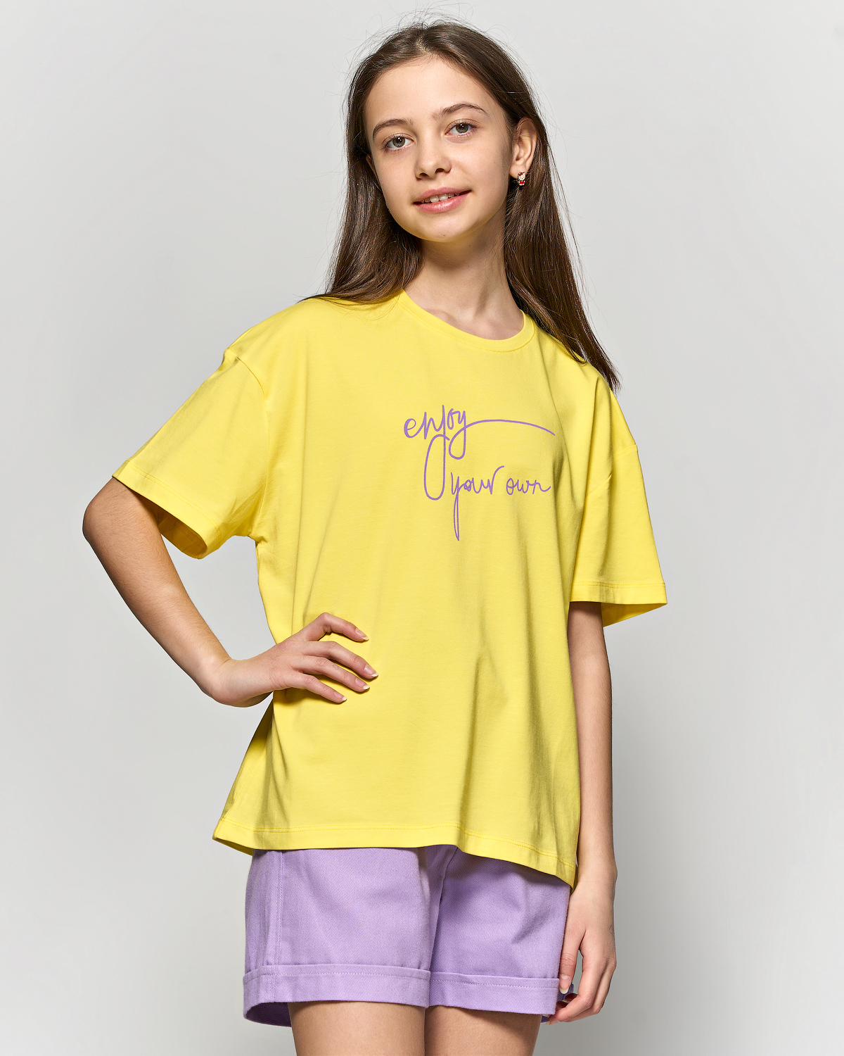 Футболка Cegisa для девочки оптом, выполнена из высококачественного трикотажа. Фасон футболки прямой, укороченный, на груди стильный принт.