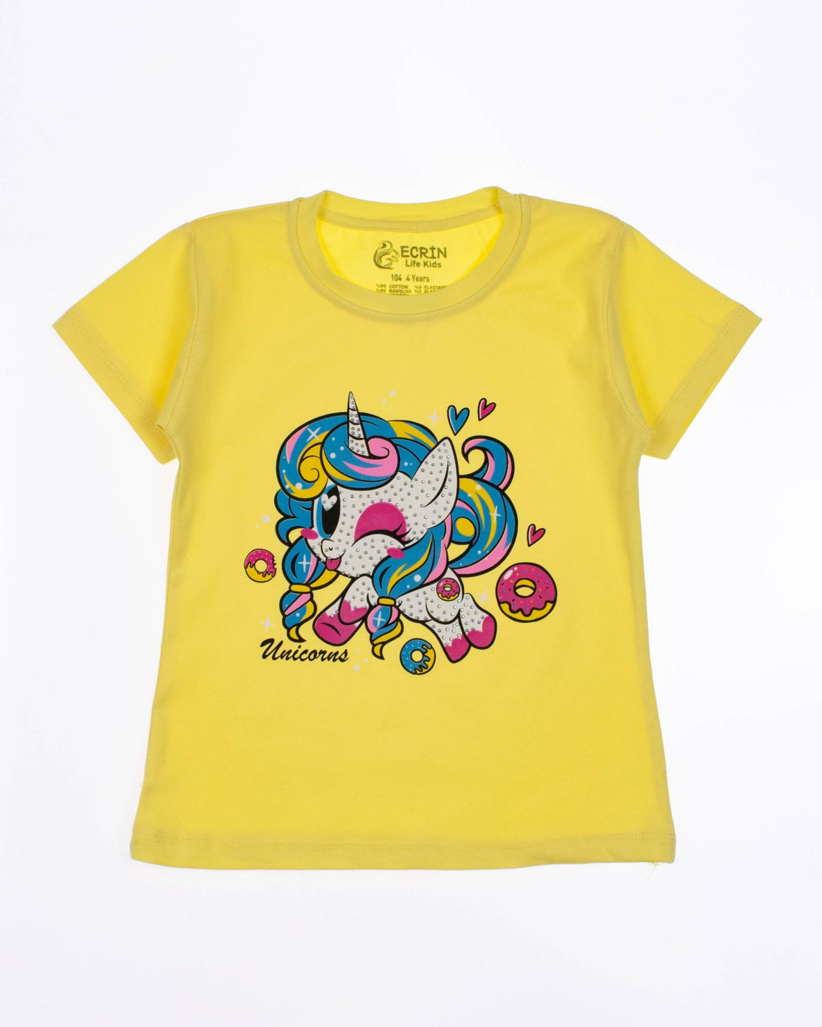 Футболка ECRIN для девочки оптом, производства Турция. Модель приталенного силуэта с короткими рукавами, милый принт украшен стразами.