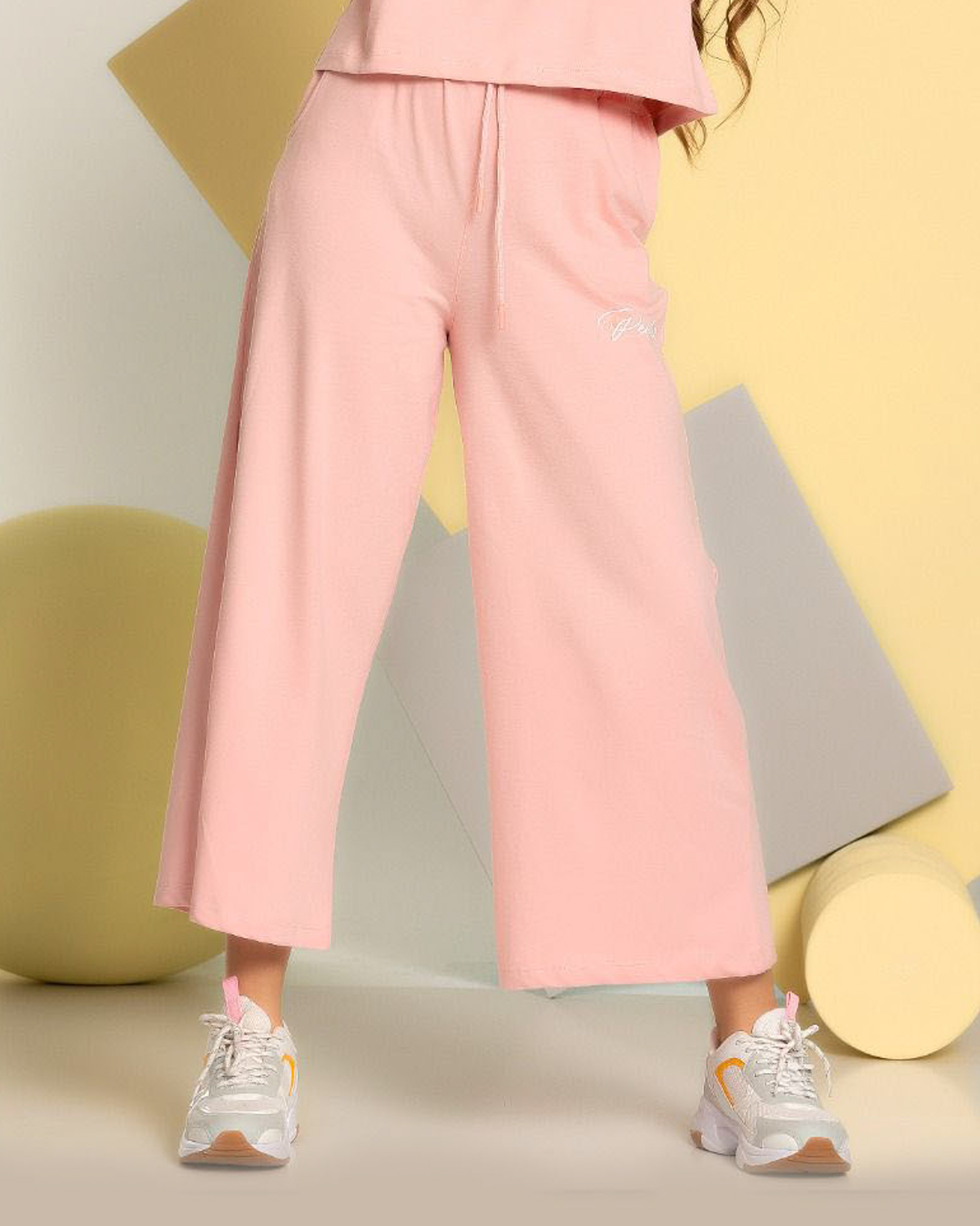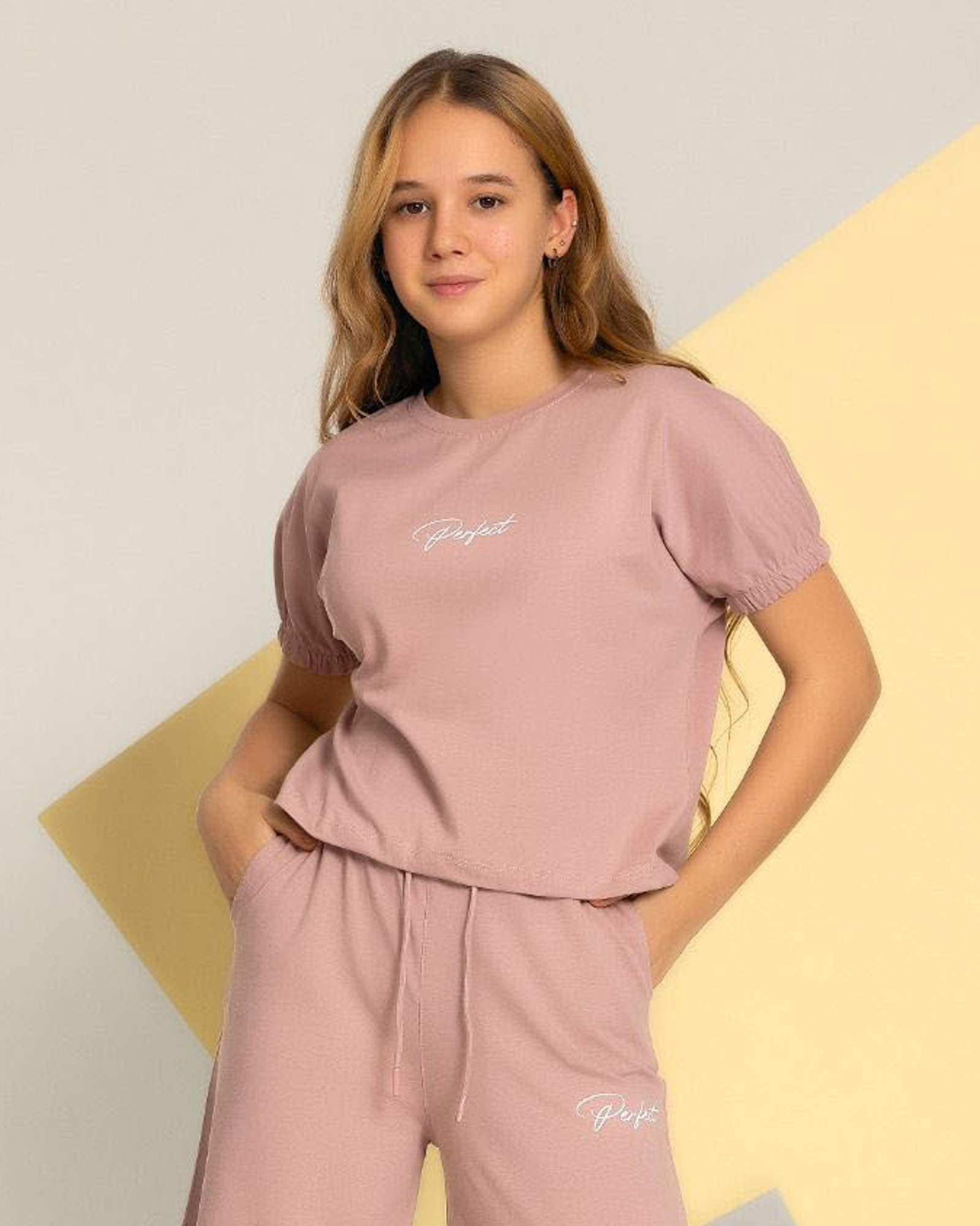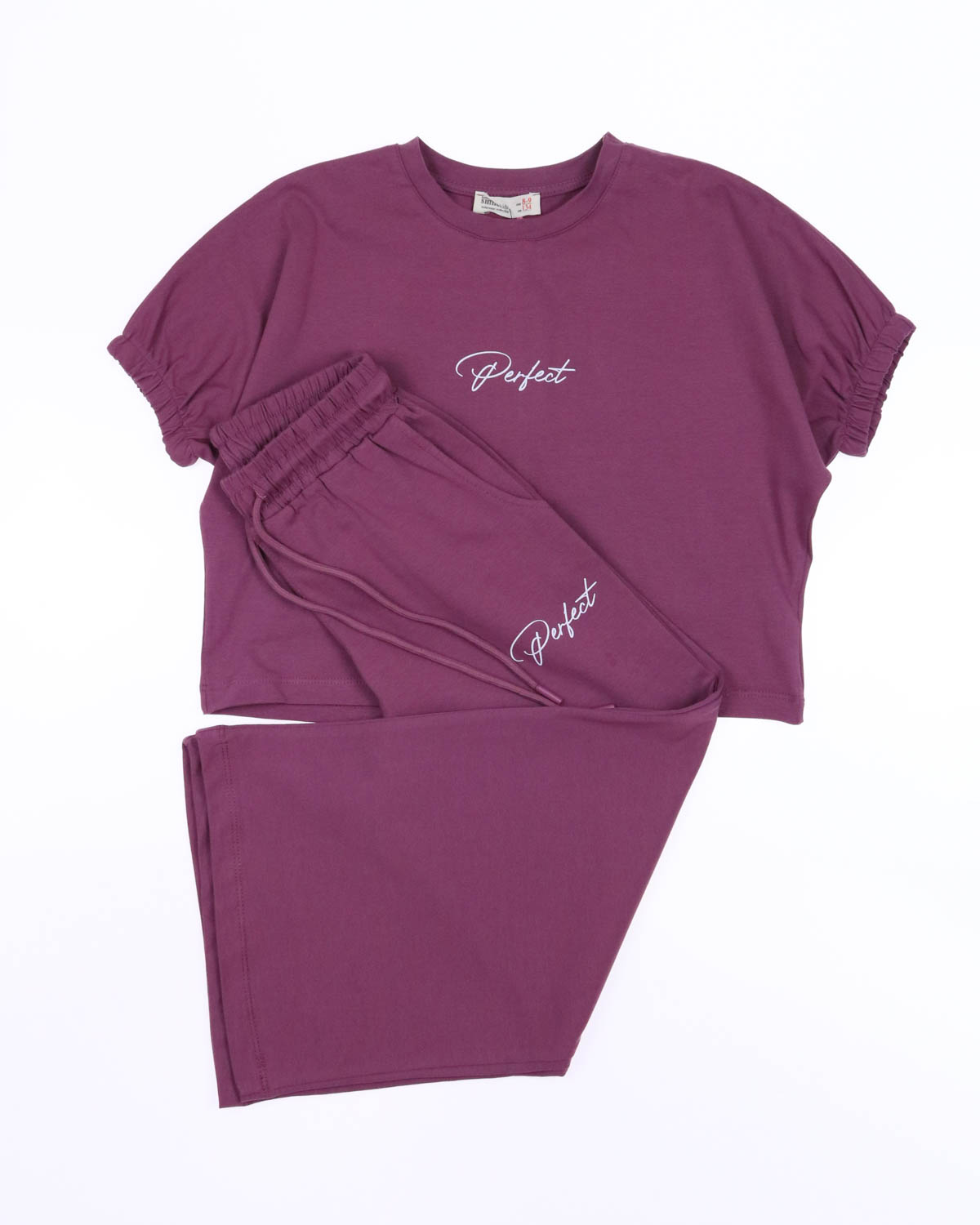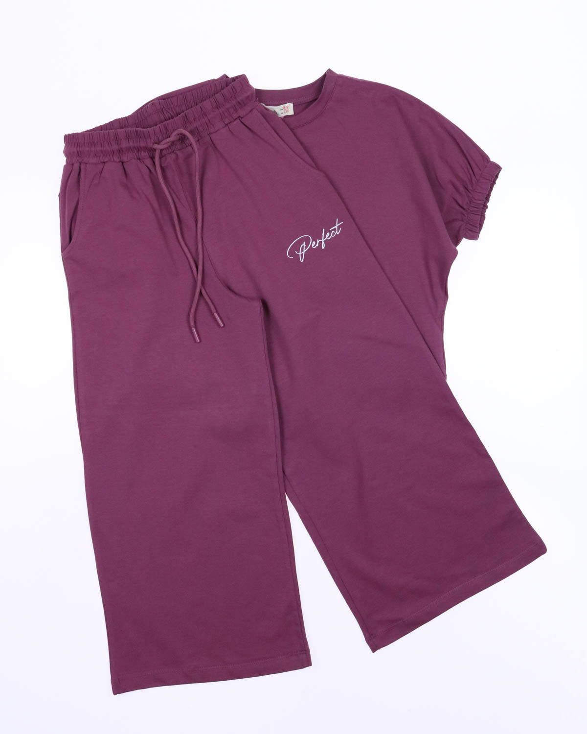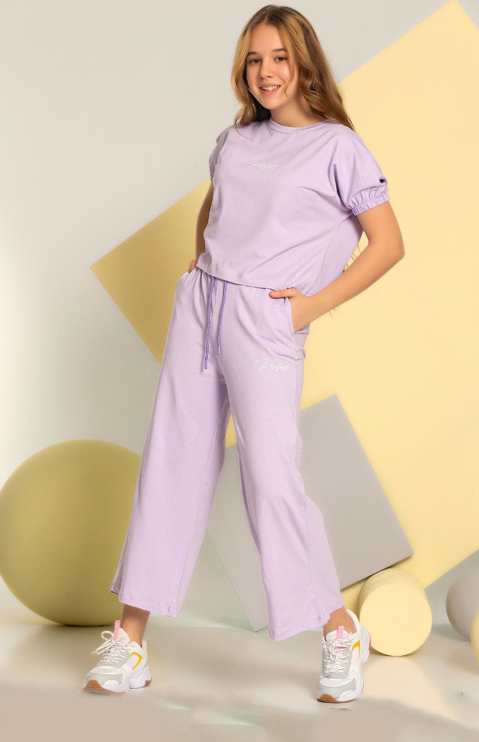 Комплект Smile оптом состоит из свободных брюк на широкой резинке и укороченной футболки. Рукава присборенны эластичной резинкой.