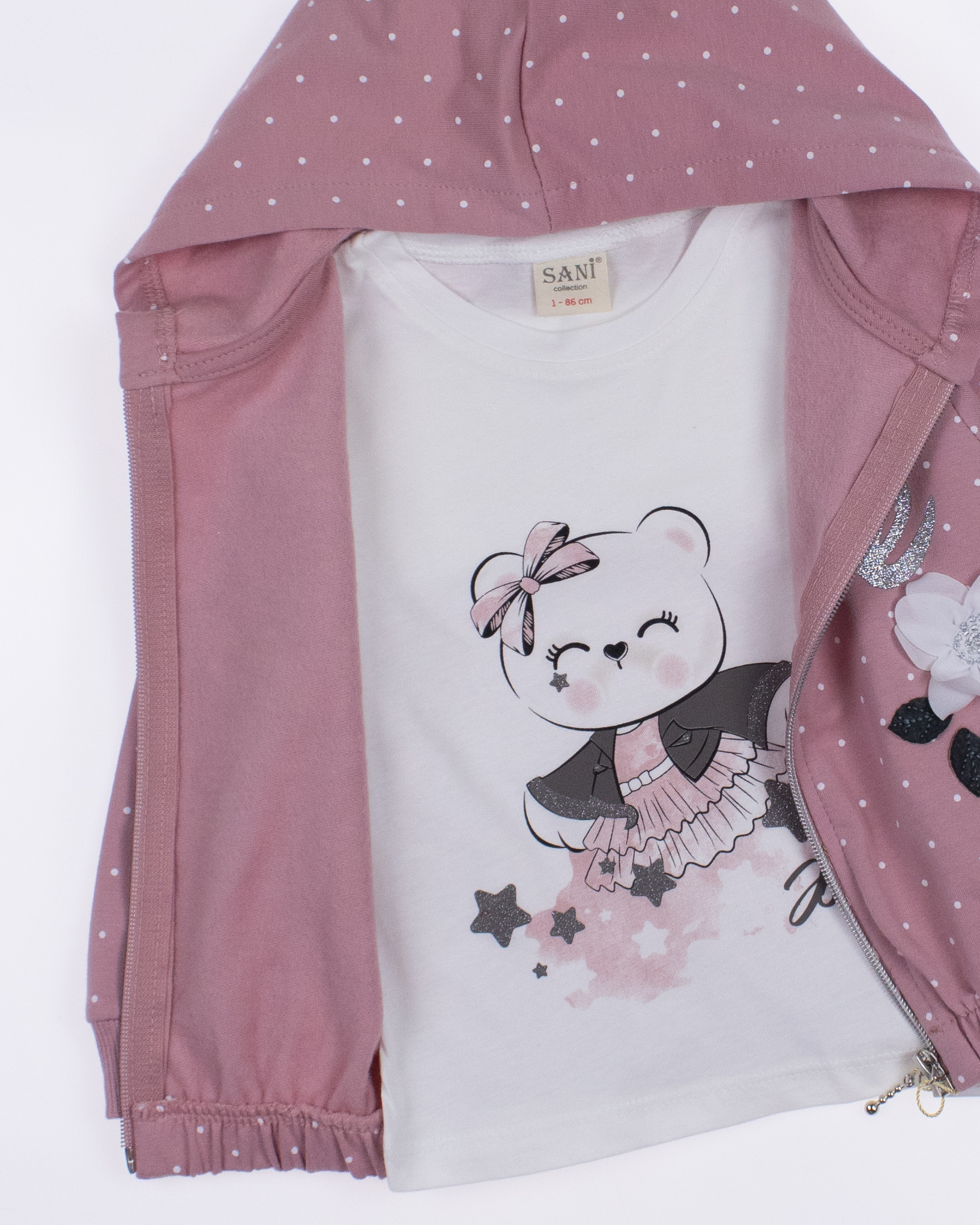 Теплый  ясельный костюм SANI оптом— это идеальный выбор для  маленькой модницы. Он состоит из трех стильных предметов, которые обеспечивают как комфорт, так и опрятный внешний вид. Костюм выполнен из качественного трикотажа  с начесом.