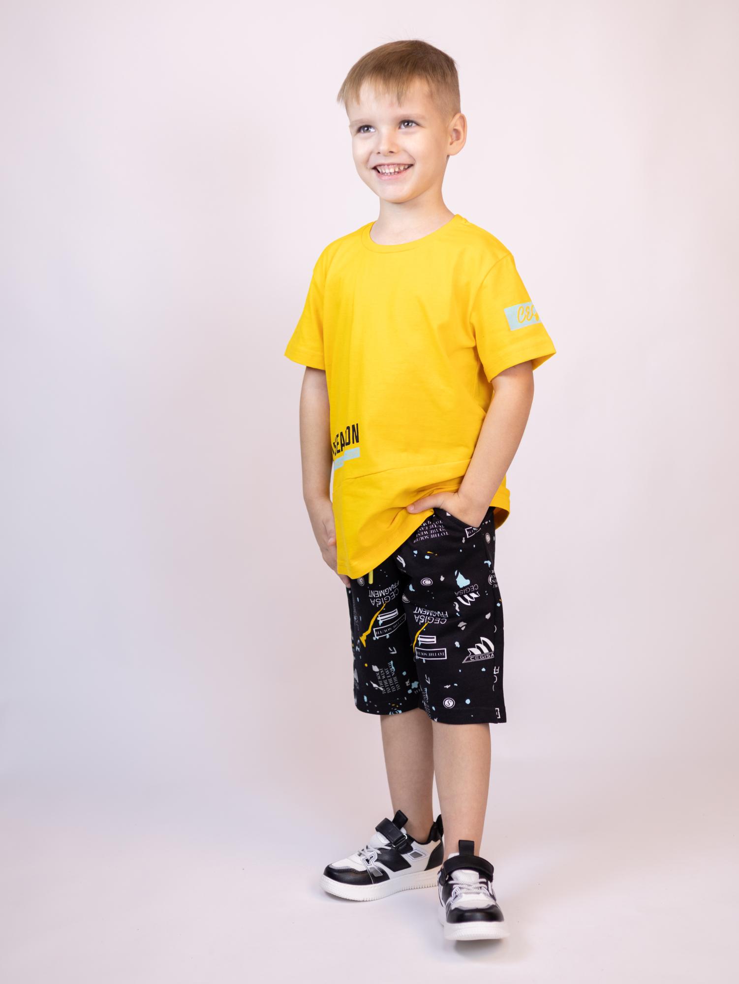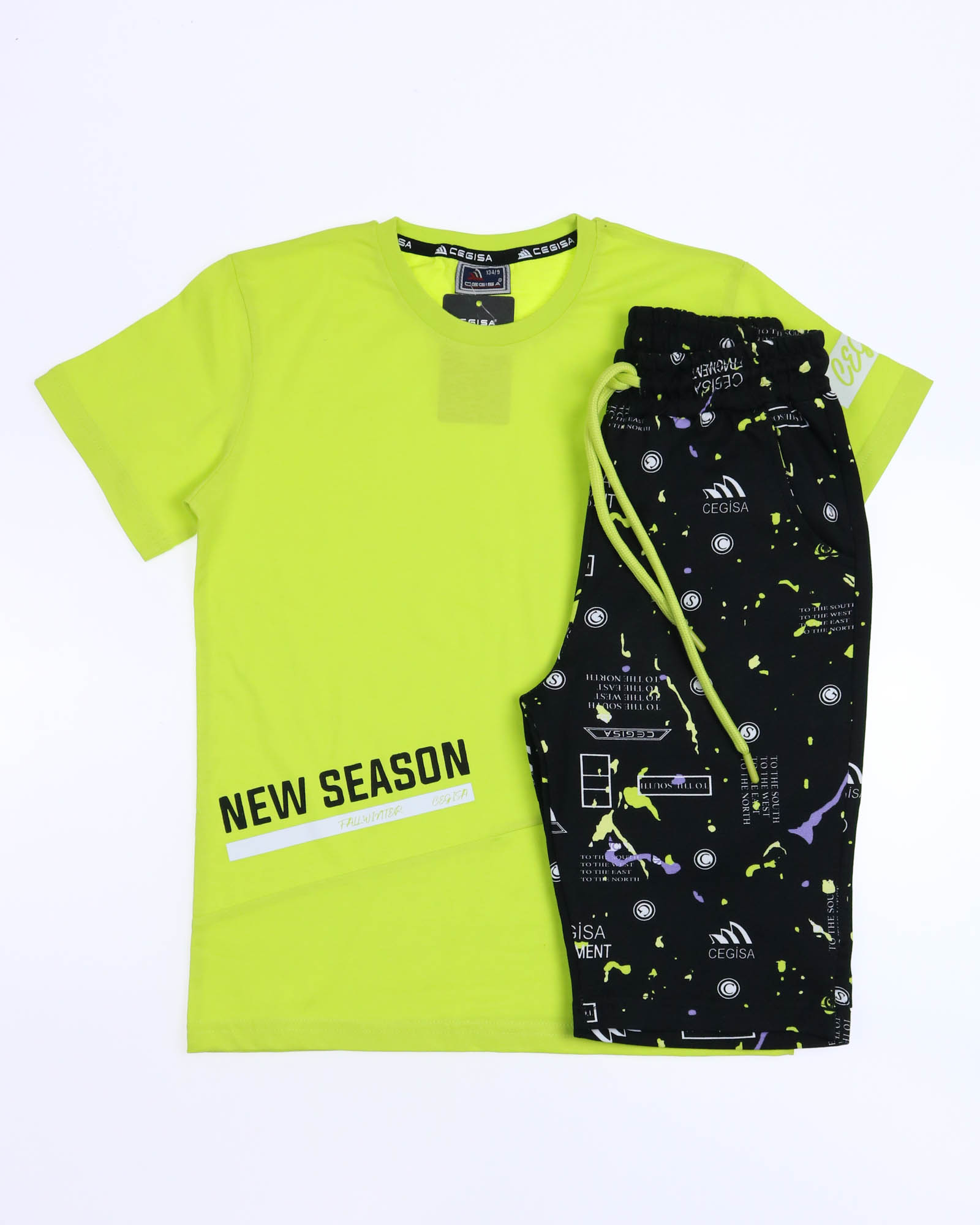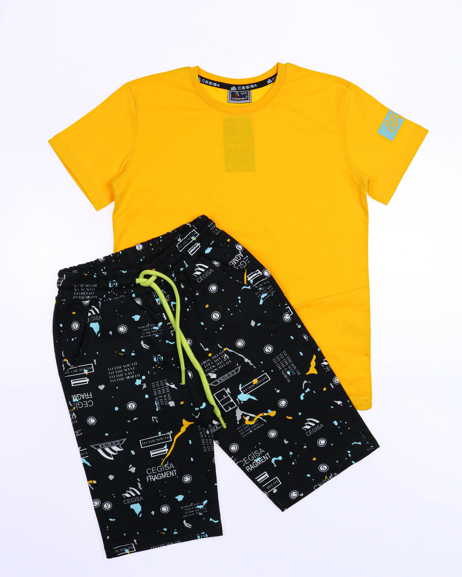 Трикотажный костюм CEGISA из хлопка оптом. Бриджи выполнены из футера 2х нитки (петля) с карманами, на эластичном поясе с регулируемым шнурком и оригинальным принтом. Футболка выполнена из кулирной глади, прямого кроя с округлой горловиной.