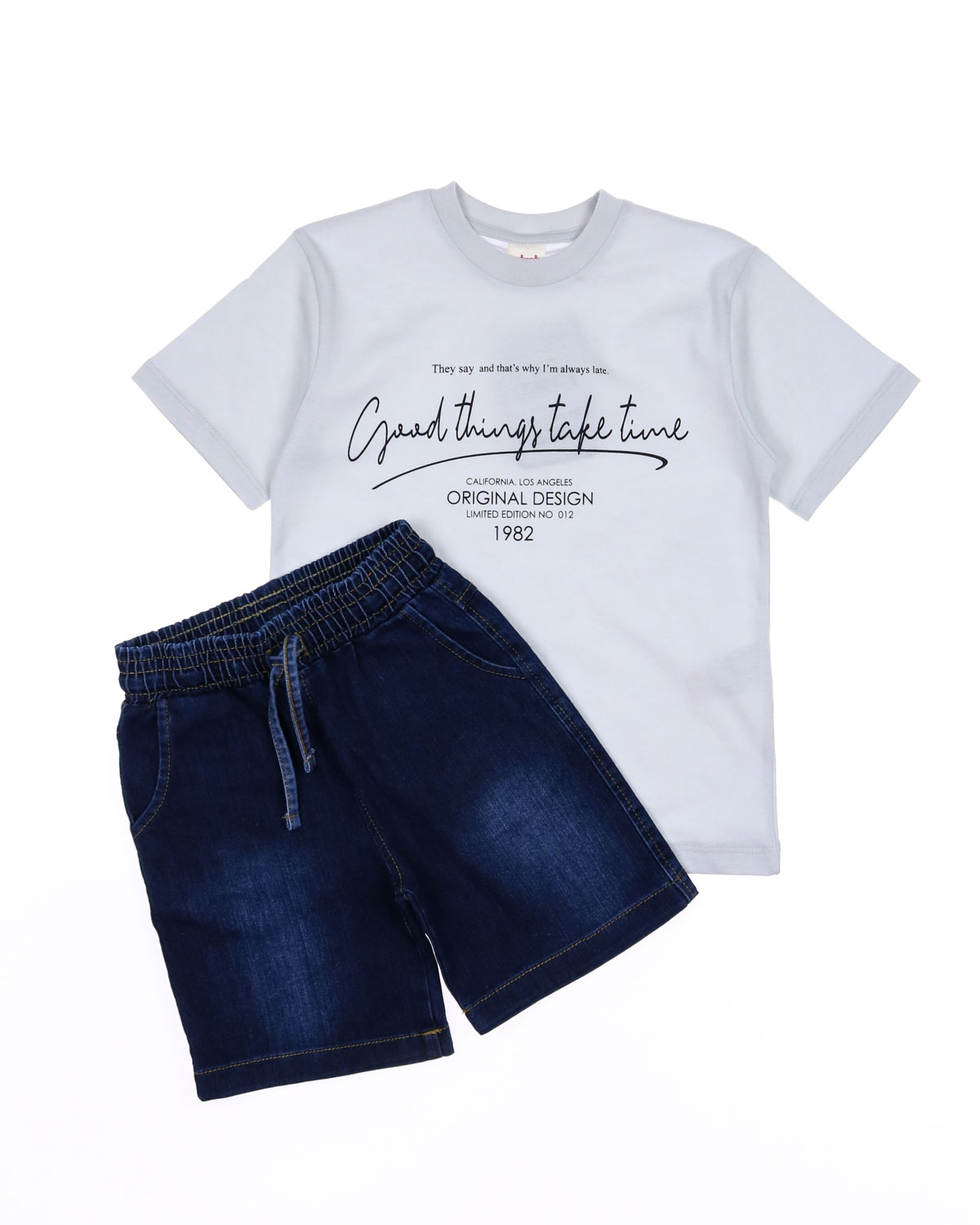 Летний костюм для мальчика dmb оптом. Футболка прямого кроя с короткими рукавами, на груди накладной карман. Бриджи из облегченной джинсы без эластана с боковыми  карманами. Пояс на резинке с функциональным шнурком позволяет ругулировать объем на талии.  Большой выбор костюмов для мальчиков по низким ценам в интернет-магазине Tamriko оптом.